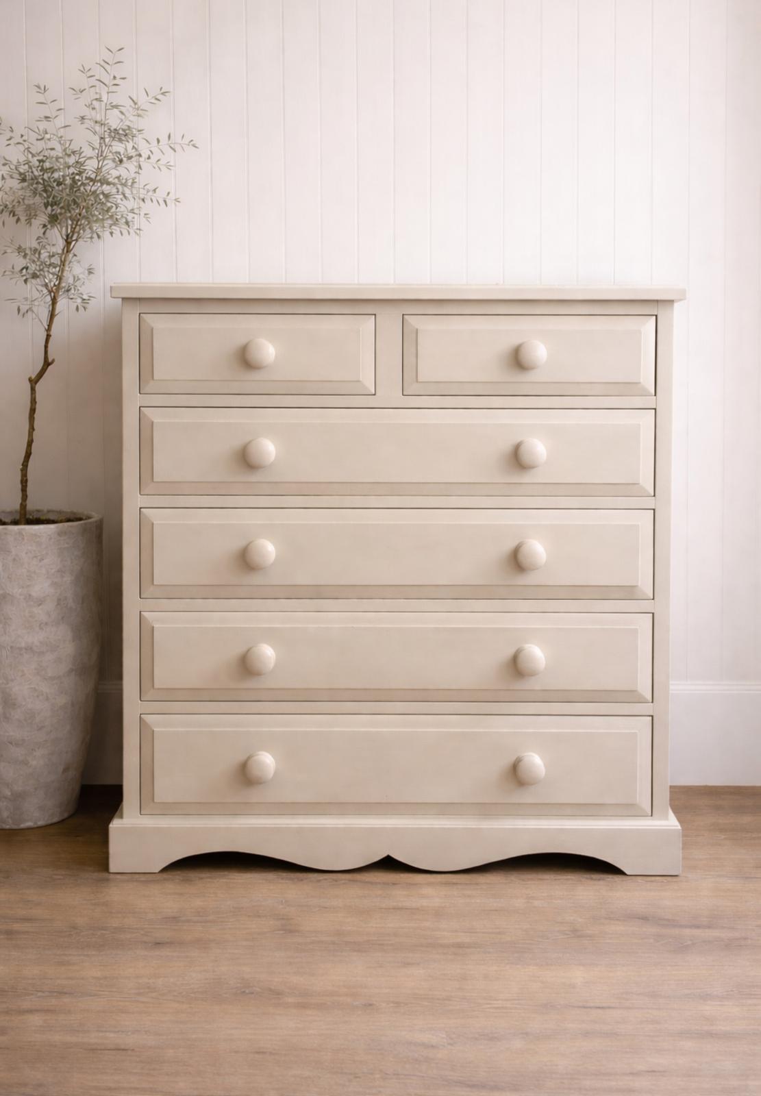 With its classic silhouette and gently curved plinth, this piece blends traditional craftsmanship with a contemporary heritage aesthetic.Featuring two smaller drawers above four generously sized drawers, it offers both practical storage and timeless style—perfect for bedrooms, hallways, or relaxed living spaces.