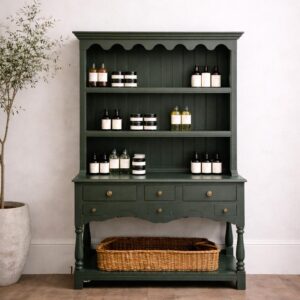 This impressive antique French chest of drawers is crafted from solid oak, showcasing it’s rich, natural grain and timeless character. Hand painted in a custom mix of Annie Sloan French Linen and Old White chalk paint which we call Lite Linen, the finish offers a luxurious antique look. The spacious, oak-lined drawers provide ample storage, and the chests substantial weight reflects its solid construction and enduring quality. A true statement piece for any home.