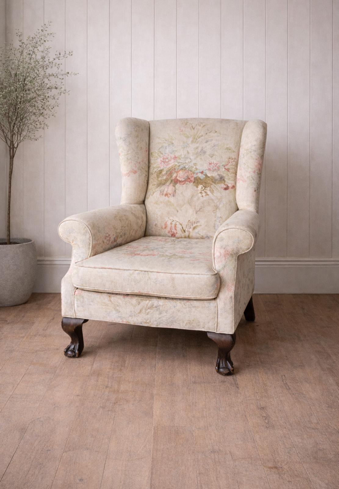 A beautifully aged linen wingback armchair, with softly faded floral tones and all the charm of time-worn upholstery. Elegant, comfortable, and full of character — this much-loved piece has found its way back to us and is now available once more.
