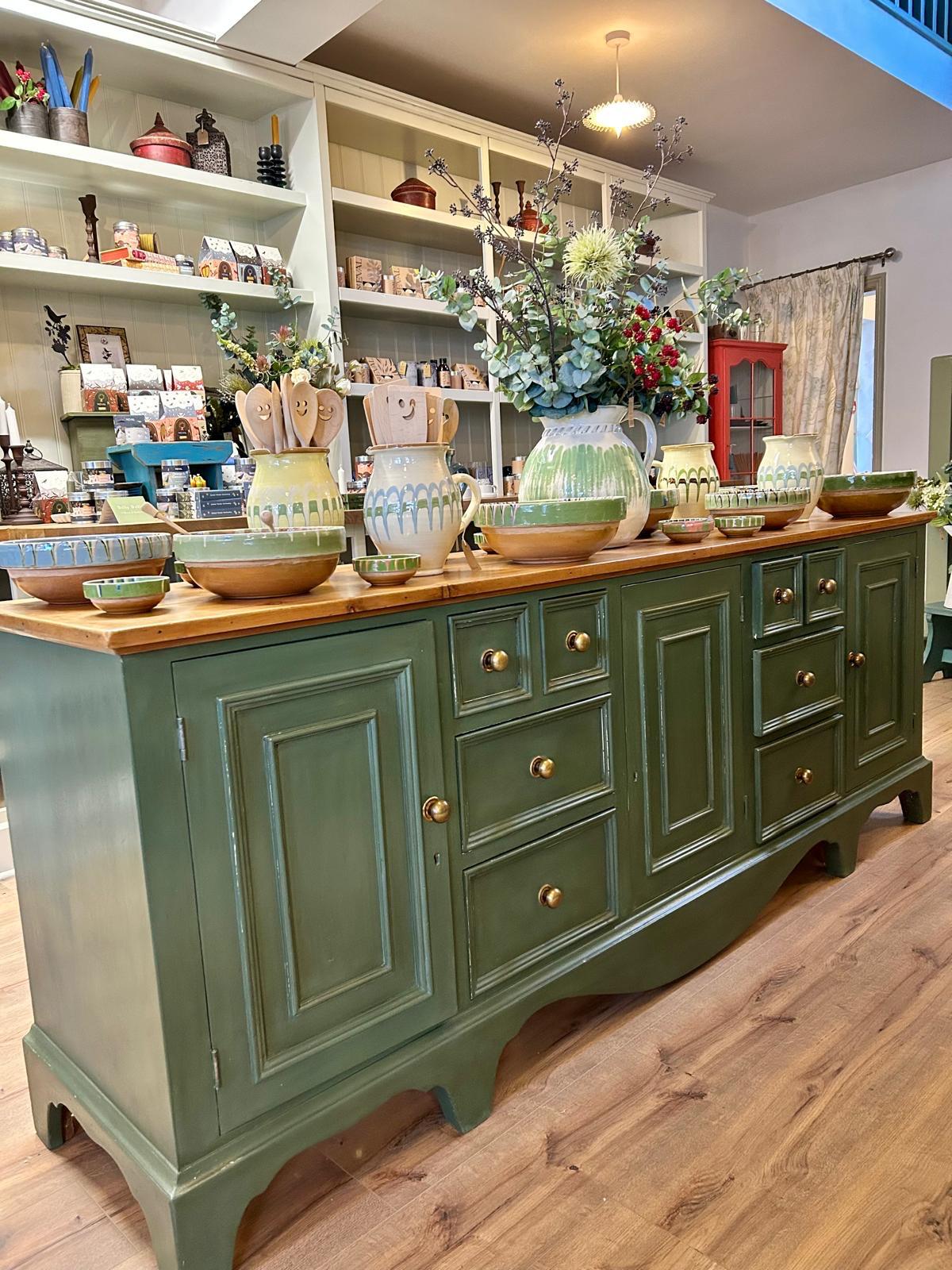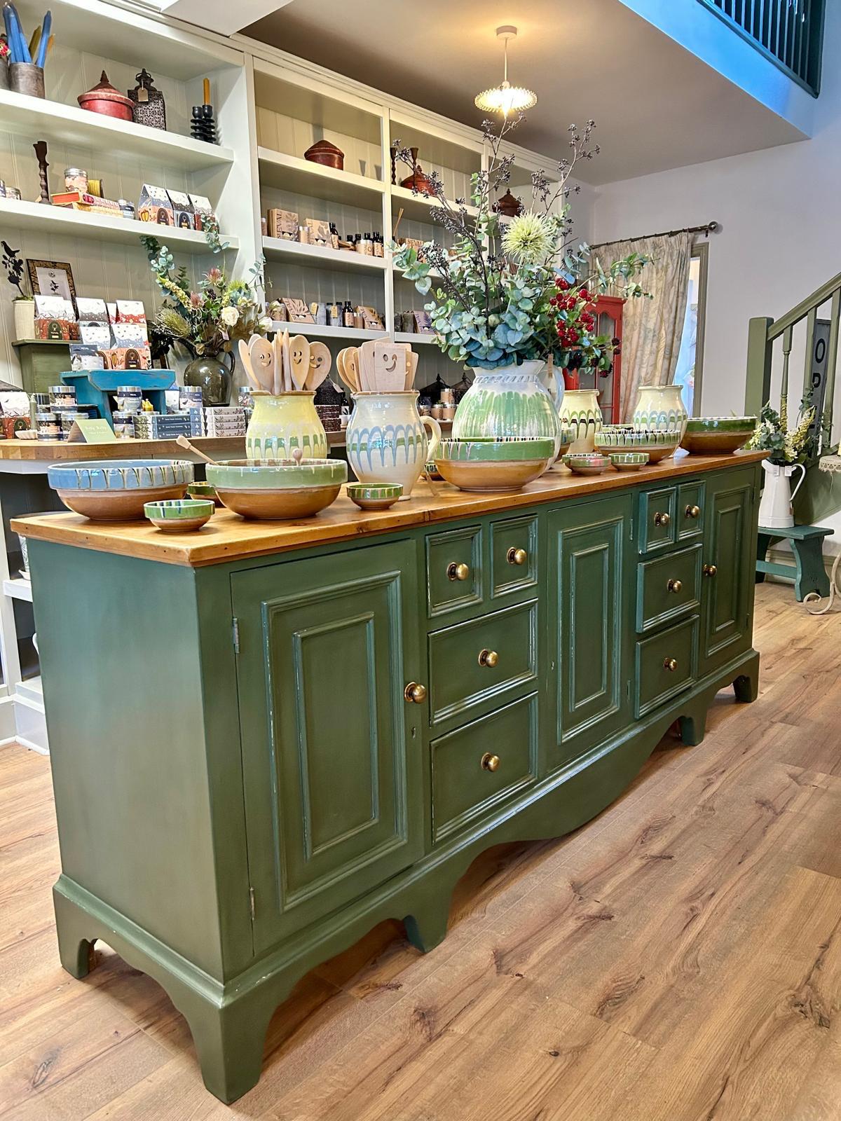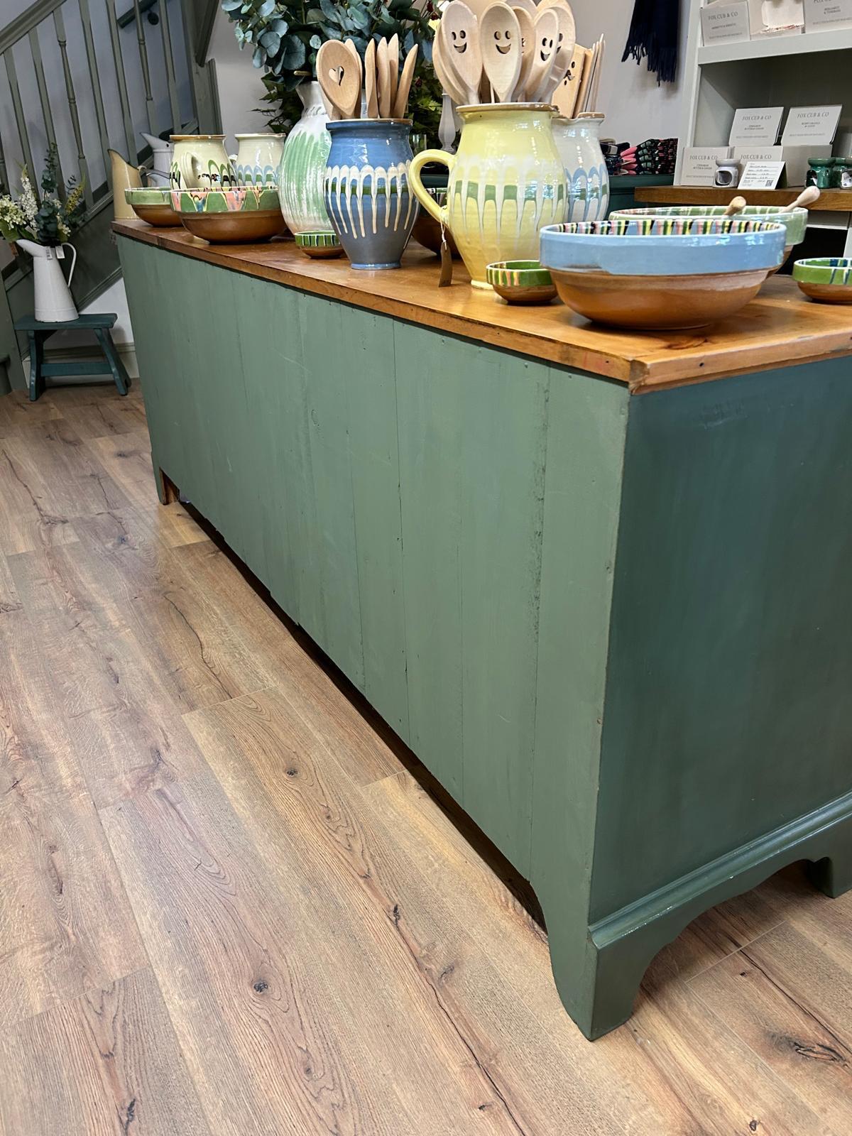 When this piece arrived with us, it was painted off white and very chippy. We’ve given her a new coat of paint in a lovely dark green and distressed a little just to show the original colour. We’ve also added new brass handles. This piece is available to view in our shop on Waterloo Lane. If you would like a delivery quote please email with your details.