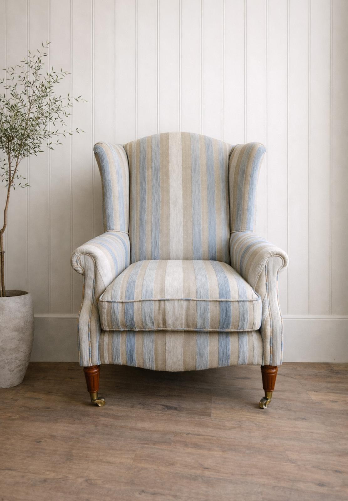 A beautifully comfortable armchair upholstered in timeless Laura Ashley fabric, featuring soft neutral tones with delicate stripe detailing.