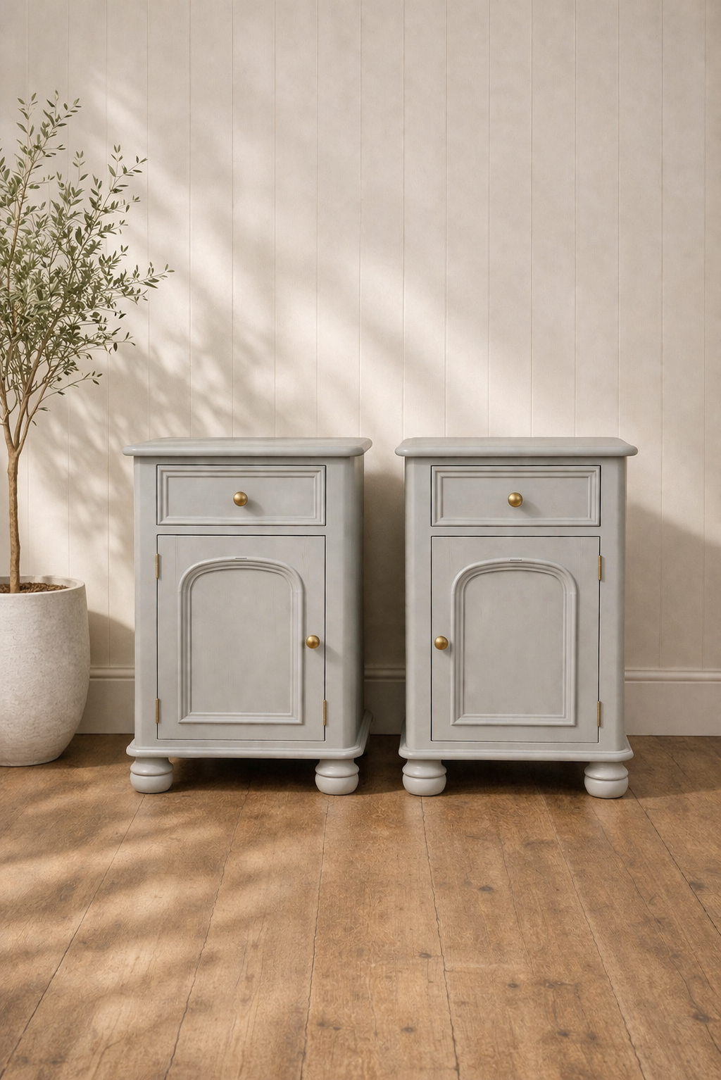 Pair of beautifully refinished bedside cabinets in a soft pale grey, finished with classic brass style hardware. Timeless, elegant and ready to style.