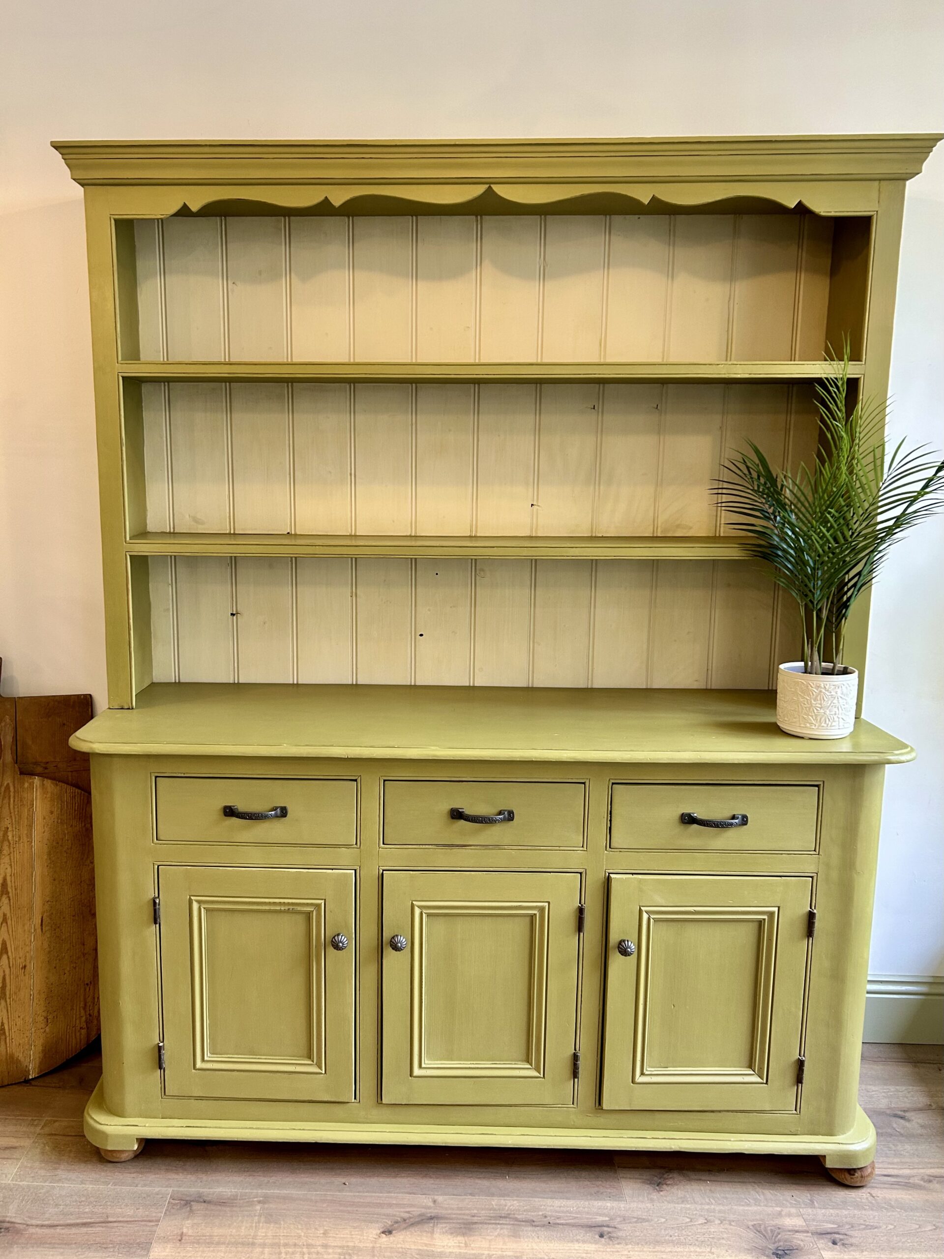 This charming pine dresser, around 30 years old, has been completely refurbished with care. We mixed a fresh, citrusy paint colour and polished it to perfection, adding new handles for a modern touch. A timeless piece with a bright contemporary twist.