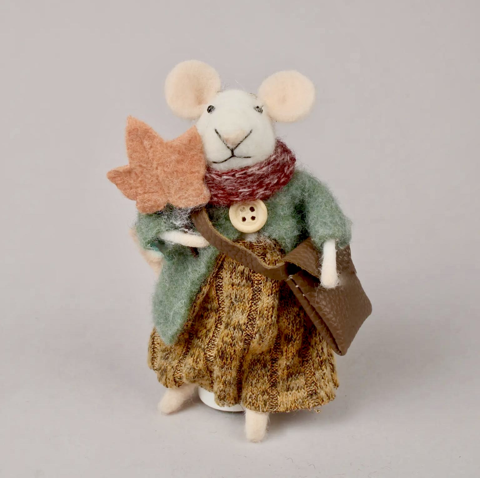 Embrace the cosy spirit of Winter with this adorable felt mouse ornament. Dressed in a tweed-style skirt, forest green coat, and chunky knit scarf, this little cutie carries a burnt orange leaf and wears a warm smile.